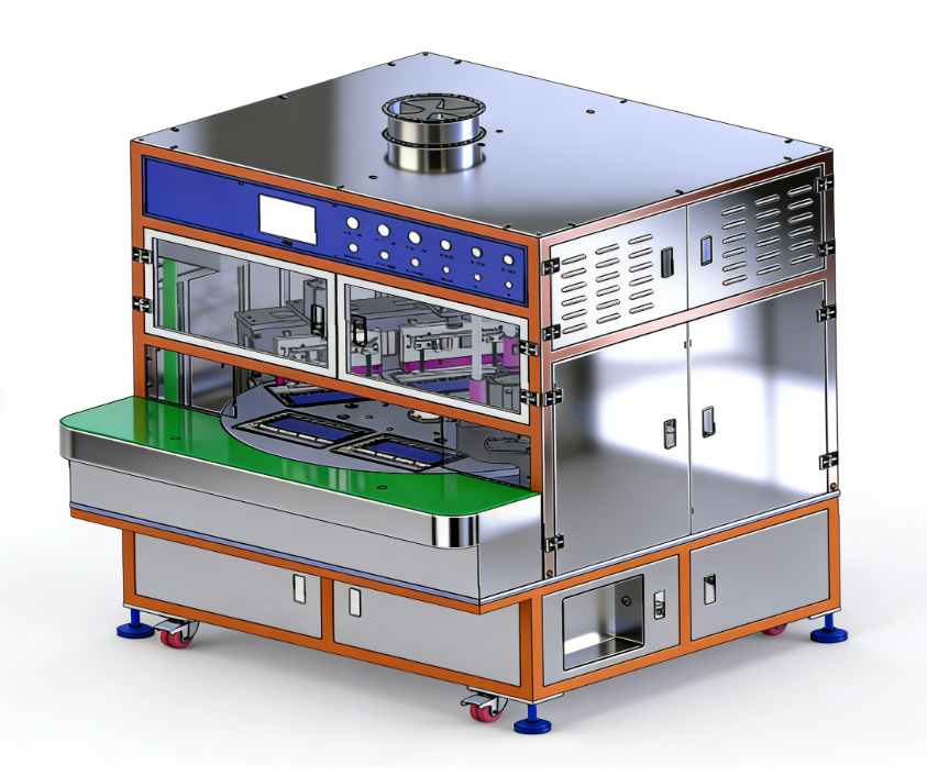| GRS-EFQB-200-3A 設(shè)備用途: 本機適用于軟包裝鋰電池(方形,圓柱)最終真空封裝及切除氣袋邊。手動放置電芯在轉(zhuǎn)盤上料機構(gòu)上,電池沖坑方向向下,通過轉(zhuǎn)盤旋轉(zhuǎn)送料,(轉(zhuǎn)盤放3個工位 |